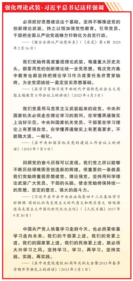 注重思想建党、理论强党,是我们党的鲜明特色和光荣传统。新征程上,广大党员干部只有坚持不懈强化理论武装,始终保持政治上的清醒和坚定,自觉在思想上政治上行动上同以习近平同志为核心的党中央保持高度一致,才能更好面对更为艰巨的历史任务。作为党的“纪律部队”,纪检监察机关始终把学习党的创新理论摆在突出位置,持续发力,不断强化理论武装,筑牢思想堤坝,提升干事创业本领,努力做自我革命的表率、遵规守纪的标杆。